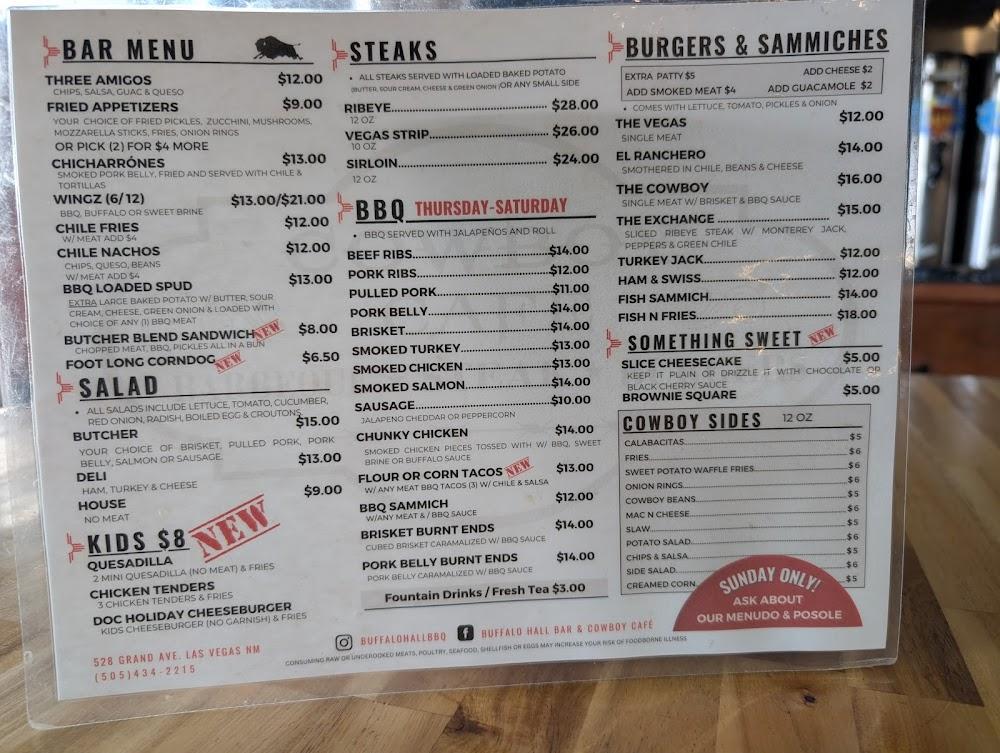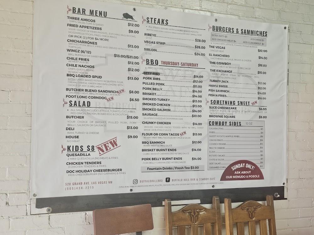 Welcome to Buffalo Hall & Cowboy Cafe BBQ, your go-to spot in Las Vegas, NM for mouthwatering grilled delights and a vibrant atmosphere. Located at 528 Grand Ave, we offer a diverse menu featuring local specialties, excellent cocktails, and a wide selection of beers—all at an affordable price range of $10-$20. Enjoy your meal on our lovely terrace or opt for takeout and delivery. With amenities like wheelchair accessibility and kid-friendly options, we cater to everyone. Don't miss our exciting concerts and relaxed vibe—perfect for lunch, dinner, or a solo outing. Join us for a true taste of the West!